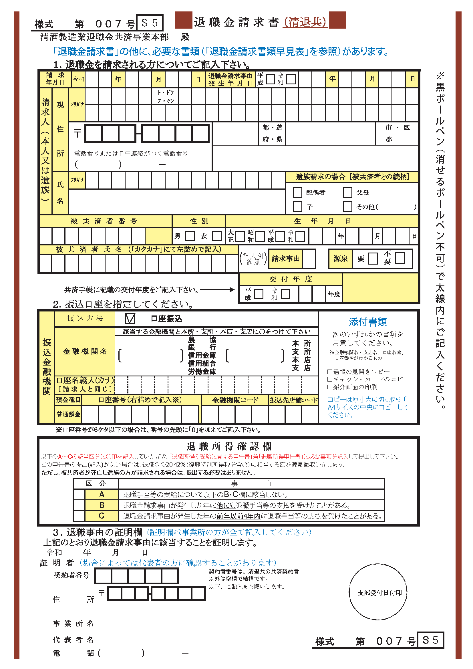 | 退職金請求書及び退職所得申告書 | ・記入要項 ・様式第007号 ・記入例 |